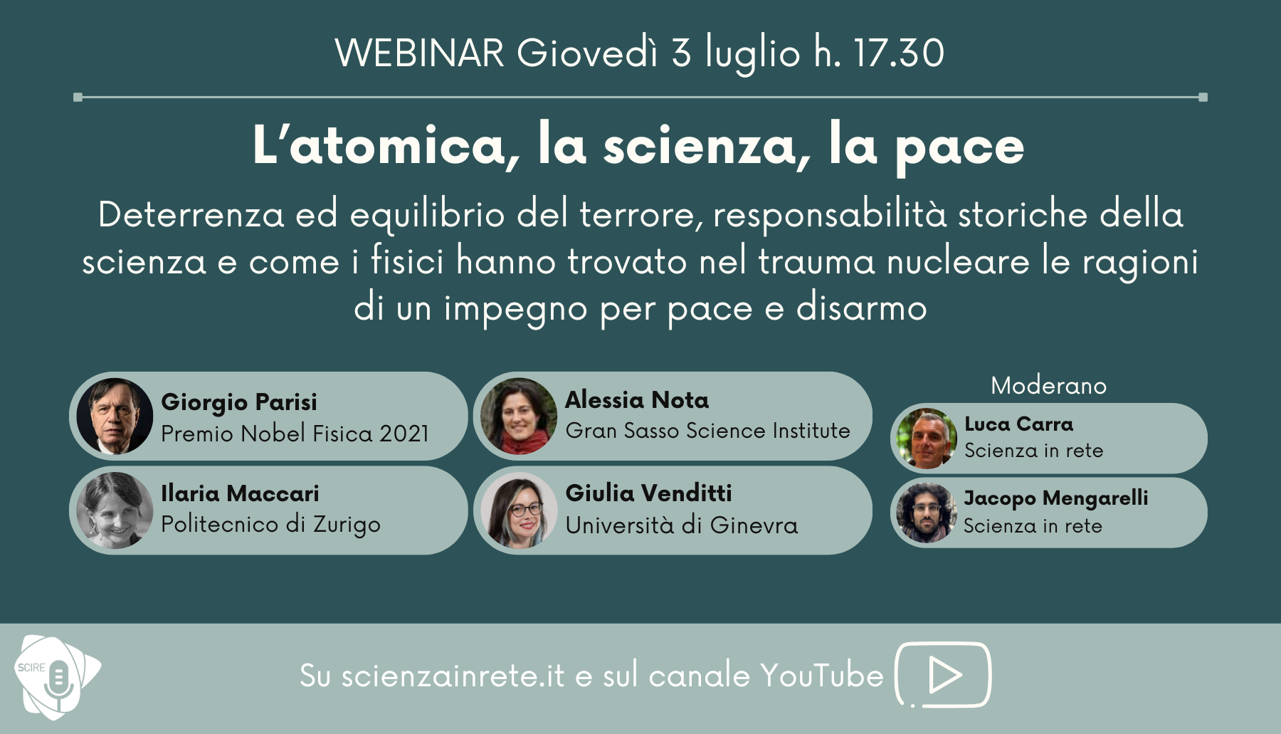Giovedì 3 luglio alle ore 17:30, partecipa al webinar “L’atomica, la scienza, la pace”, che a partire dal nuovo libro di Pietro Greco L’atomica e la responsabilità della scienza (L’asino d’oro edizioni) vuole fare il punto su deterrenza ed equilibrio del terrore, le responsabilità storiche della scienza e di come i fisici hanno trovato nel trauma della bomba le ragioni di un impegno per la pace e il disarmo. Ed infine la catastrofe umanitaria di Gaza e la crisi del diritto internazionale. Intervengono Giorgio Parisi, Premio Nobel per la fisica 2021. Ilaria Maccari, Istituto di fisica teorica Politecnico federale (ETH), Zurigo. Alessia Nota, Gran Sasso Science Institute (GSSI), L’Aquila. Giulia Venditti, Dipartimento Quantum Matter Physics Università di Ginevra. Conducono Luca Carra e Jacopo Mengarelli.